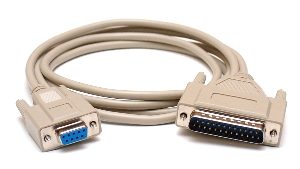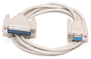 For connecting an Apple Super Serial card to a typical PC port, this cable has a 25-pin male DB25 connector on one end and a female 9-pin DE9 connector on the other. It is wired straight through, and so requires the jumper block on the Super Serial card to be pointing towards the word “Terminal.” See here for details.