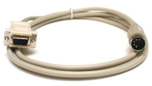 Approximately 6 feet long, made with shielded cable. Converts the Apple IIgs, IIc+, or the Mac LC III modem port to a female DE-9 connector, typical on older PCs with RS-232 serial ports. A newer computer will likely also need a USB adapter, below.